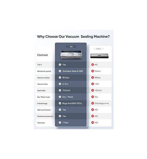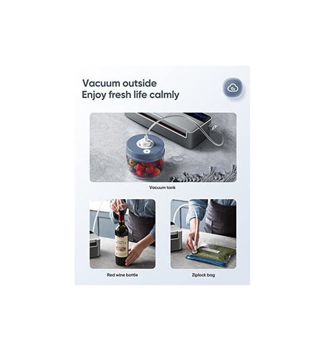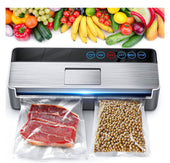Diseño exclusivo: el sellador automático al vacío tiene un diseño elegante y un color de moda que se adapta perfectamente a la estética de diseño contemporáneo. Tamaño compacto y diseño ligero que son fáciles de almacenar y mover Funcionamiento con un solo toque: diseñado con operación de sellado al vacío totalmente automática. Simplemente coloca la bolsa en la máquina, elige el modo seco/húmedo, comenzará a aspirar y sellar automáticamente. Puedes quitar la tapa superior para limpiar la máquina selladora de forma fácil y segura 5 modos ajustables: seco/húmedo/VAC/vacío externo/sellado. Simplemente coloca tu bolsa en la máquina, elige el modo seco/húmedo, comenzará a aspirar y sellar automáticamente. dentro del modo VAC, puedes controlar el tiempo de vacío para adaptarse a lo que selles. Proporciona a tu comida la mejor conservación posible en función de tus diferentes tipos Experiencia fácil de usar: máquina selladora diseñada con operación de sellado al vacío totalmente automática, todos los paneles de acero inoxidable, luces indicadoras LED, enchufe eléctrico y el panel de control táctil digital proporciona una experiencia fácil de usar para ti Función de vacío externa: viene con 10 bolsas selladoras al vacío, 2 puertos de accesorios para ser utilizados para sellar tarros de conserva de boca ancha, como tarros, botella de vino y un recipiente de marinado para marinar rápidamente las carnes. Nuestros accesorios son compatibles con la mayoría de los modelos