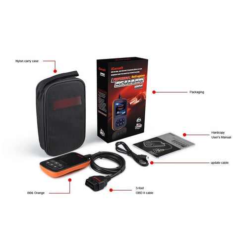 * Escaner IcarSoft i906 para Volvo y Saab OBDll Multisistema. Manual del usuario, Cable OBD II, cable USB, bolsa de transporte de nylon.