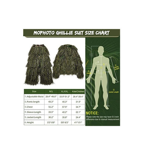 Diseño de camuflaje. El traje Ghillie está diseñado como una prenda protectora, ya que permite que las personas se mezclen con el entorno exterior. El paquete de traje Ghillie 5 en 1 incluye capucha, chaqueta, pantalones, funda para pistola. Aplicación amplia Poliéster resistente y duradero e hilo sintético. Ampliamente utilizado para la caza, el tiro, la caza de aves silvestres, el acecho, el paintball, el airsoft, la vigilancia, la fotografía de vida silvestre, la observación de aves, Halloween y cualquier otra situación en la que necesite un camuflaje profundo.