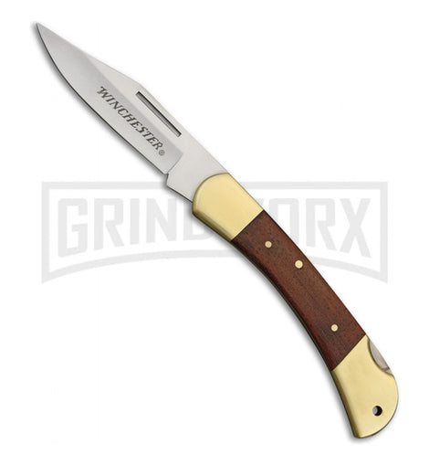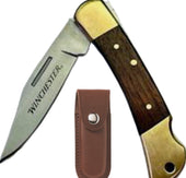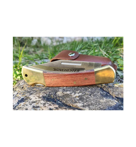 Navaja plegable Winchester G41322 con hoja de Acero Inoxidable y mangos de madera marrón. Con funda de Piel Para Llevar en el Cinturón.