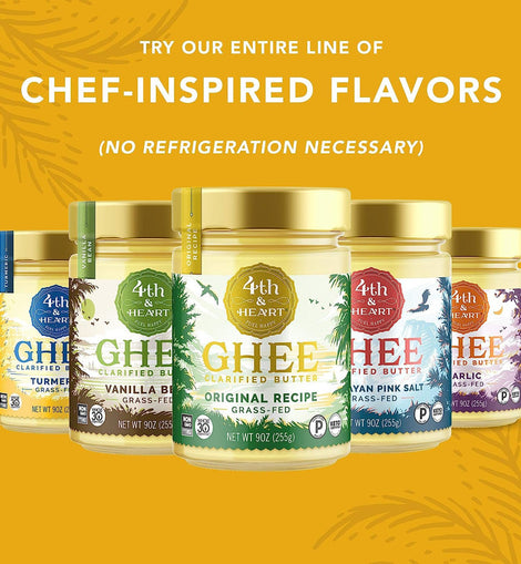 Disfruta del auténtico Ghee de 4th & Heart, elaborado con mantequilla orgánica. Nuestro ghee es batido hasta obtener una textura suave y cremosa, lo que lo hace fácil de untar, como la mantequilla. Disponible en cinco sabores únicos que complementarán cualquier comida. Naturalmente rico en vitaminas A, E y K, Omega-3, CLA y ácido butírico.