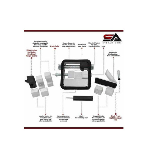 El modelo Gen 4 del Sylvan Arms Standard Sight Pusher, esta herramienta de empuje de mira más amplia y más avanzada, que fue diseñada para ajustar / quitar / empujar / reemplazar las miras de cualquier pistola de cualquier arma de mano / modelo. Con un marco de acero 9310 endurecido, bloques de aluminio 6160, con dos bloques de empuje mecanizados CNC de precisión distinta (uno estándar y otro especializado para visores tipo "snake eye" o "ringer") funda de transporte acolchada, herramienta de desmontaje glock y herramienta de extracción de mira delantera glock. El kit de Herramientas universa de ajuste de miras más completo disponible en su rango de precios.